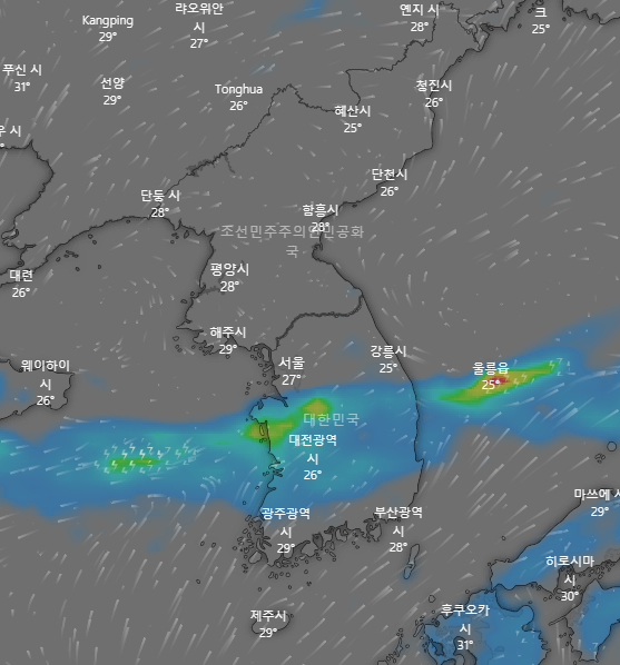 글을 작성하면서 지금 우리나라 상공에 비구름이 어떻게 비를 내리고 있는지 확인을 해 봤더니, 중부지방과 남부지방 경계에 있는 충청도와 경상북도에 걸쳐 있는 것을 볼 수 있었습니다.
