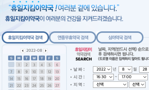 사이트에 접속하면 휴일지킴이 약국으로 연결이 됩니다. 검색하려는 지역과 방문하려는 시간을 고르면 됩니다. 접속을 한 날짜로 날짜는 자동 지정되기 때문에 오늘 문여는 약국 찾을 때는 따로 바꿀 것은 없습니다.